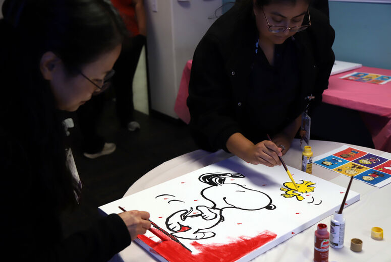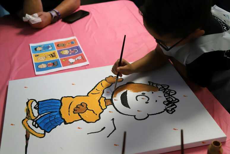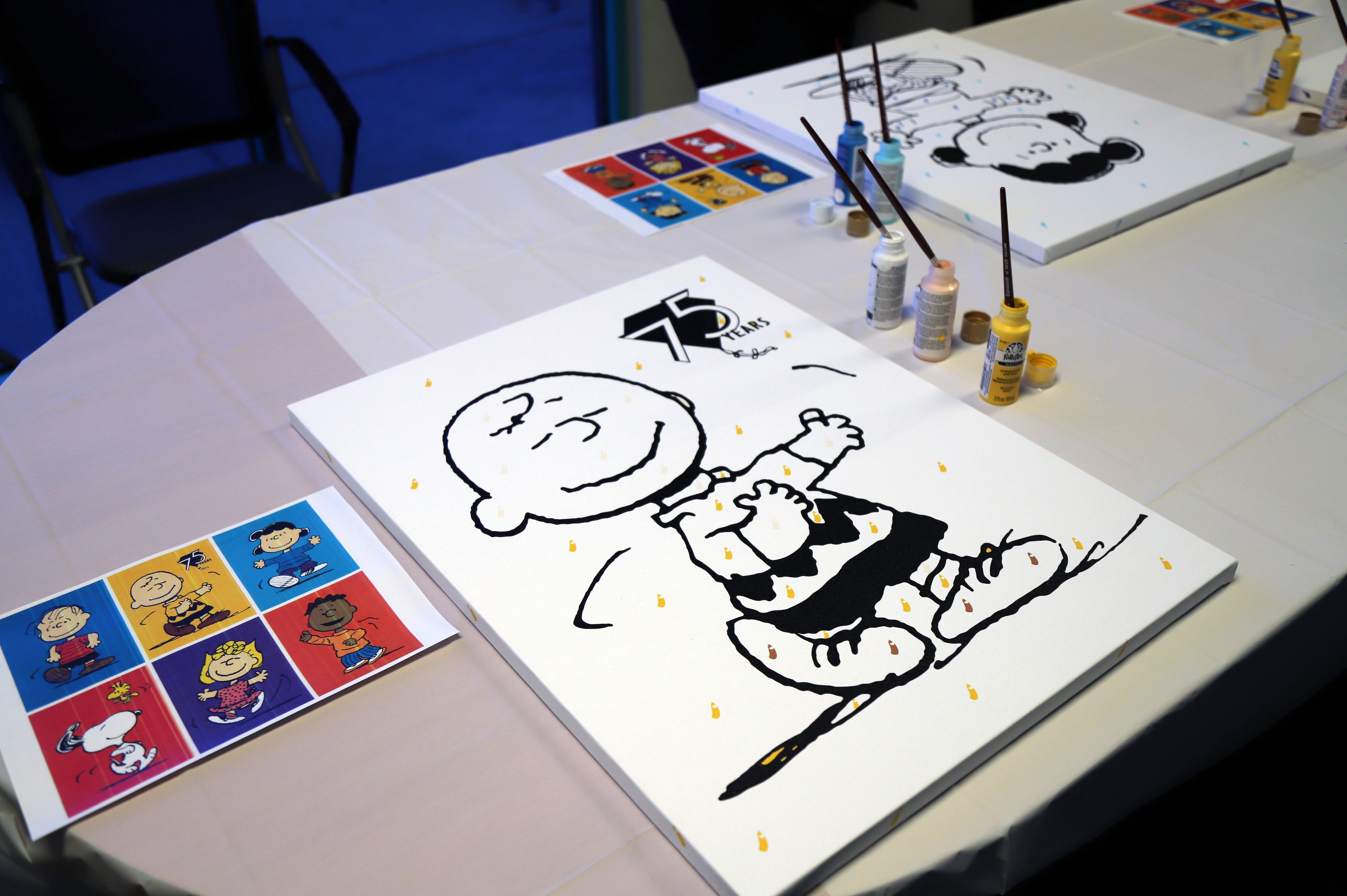 With excitement and paintbrushes at hand, patients and staff worked together on Thursday to bring to life the 56”x49” six-panel, paint-by-numbers style mural. This mural celebrates Peanuts’ 75th Anniversary year and features colorful images of Charlie Brown, Snoopy and Woodstock, Linus, Lucy, Sally, and Franklin.