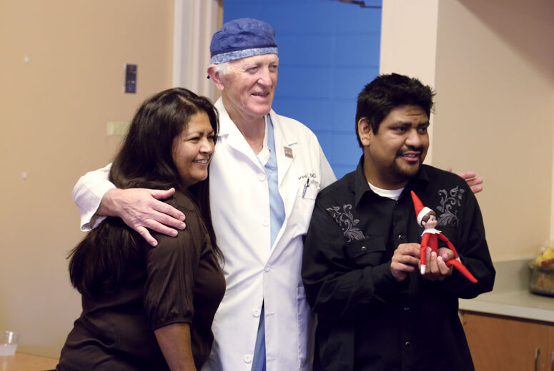Dr. Leonard Bailey embraces the parents of infant Eddie Anguiano back in 1985