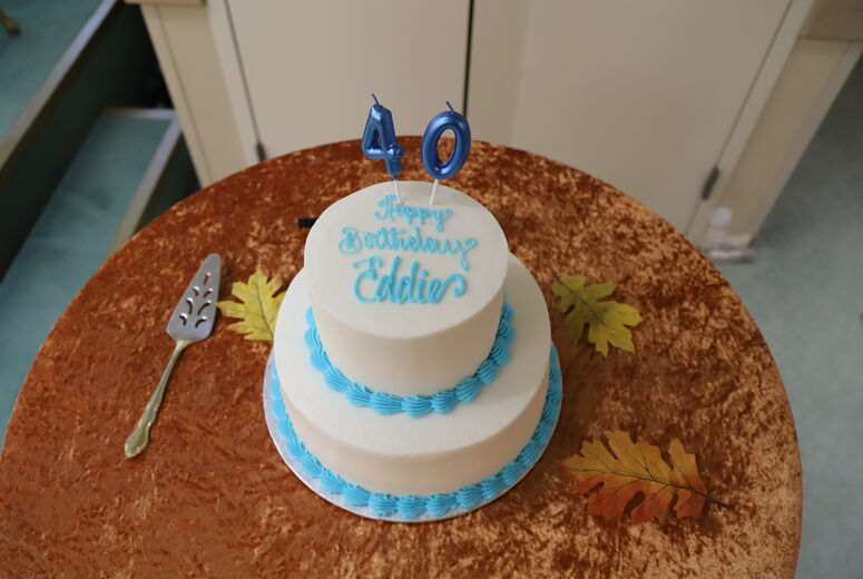 Eddie “Baby Moses” Anguiano blows out the candles on his 40th birthday cake alongside his mom and members of Loma Linda University Health care team